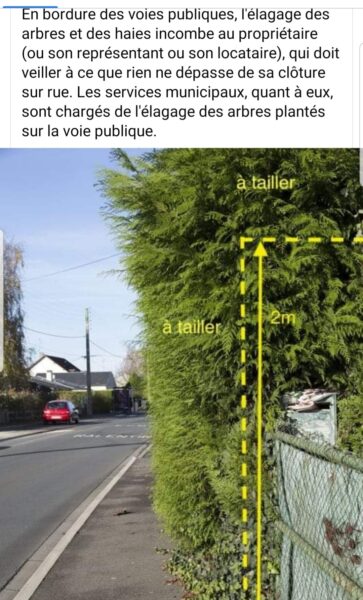 Les branches des haies et des arbustes dépassant les limites des propriétés sur les trottoirs ou sur la voie publique doivent être coupées.
